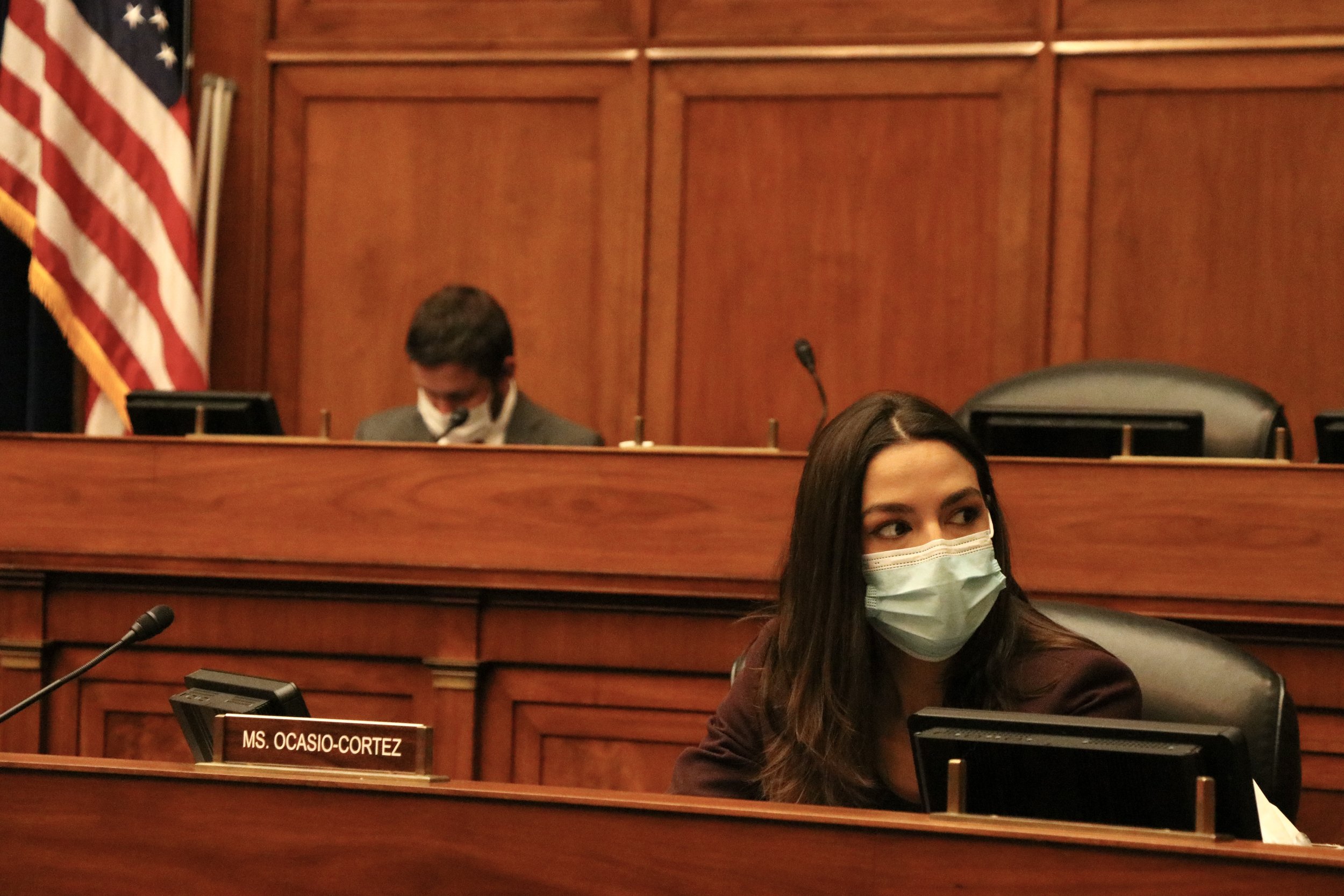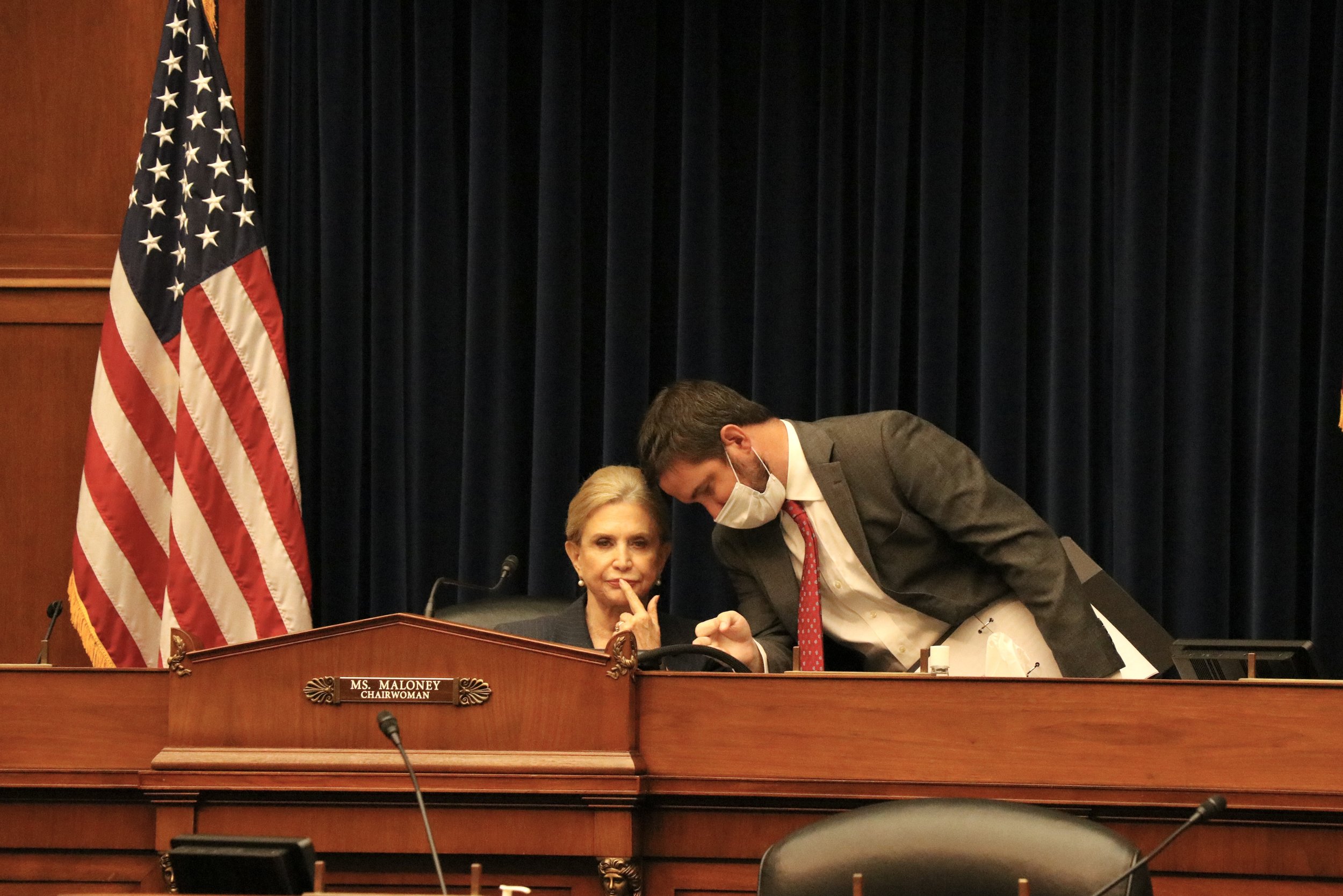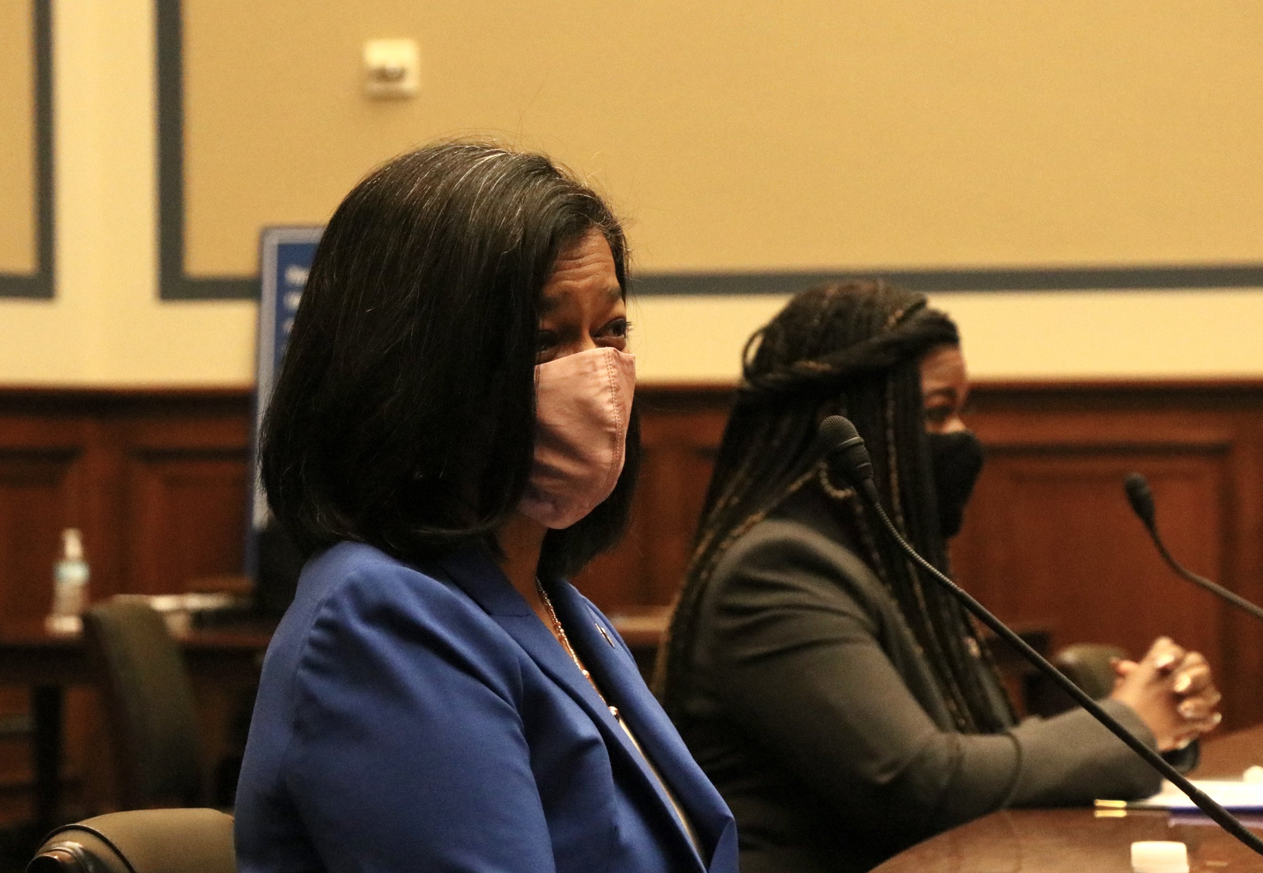 Rep. Pramila Jayapal, D-Wash. (left), and Rep. Cori Bush, D-Mo. (right), before beginning their testimony. (Julia Mueller/Medill News Service)