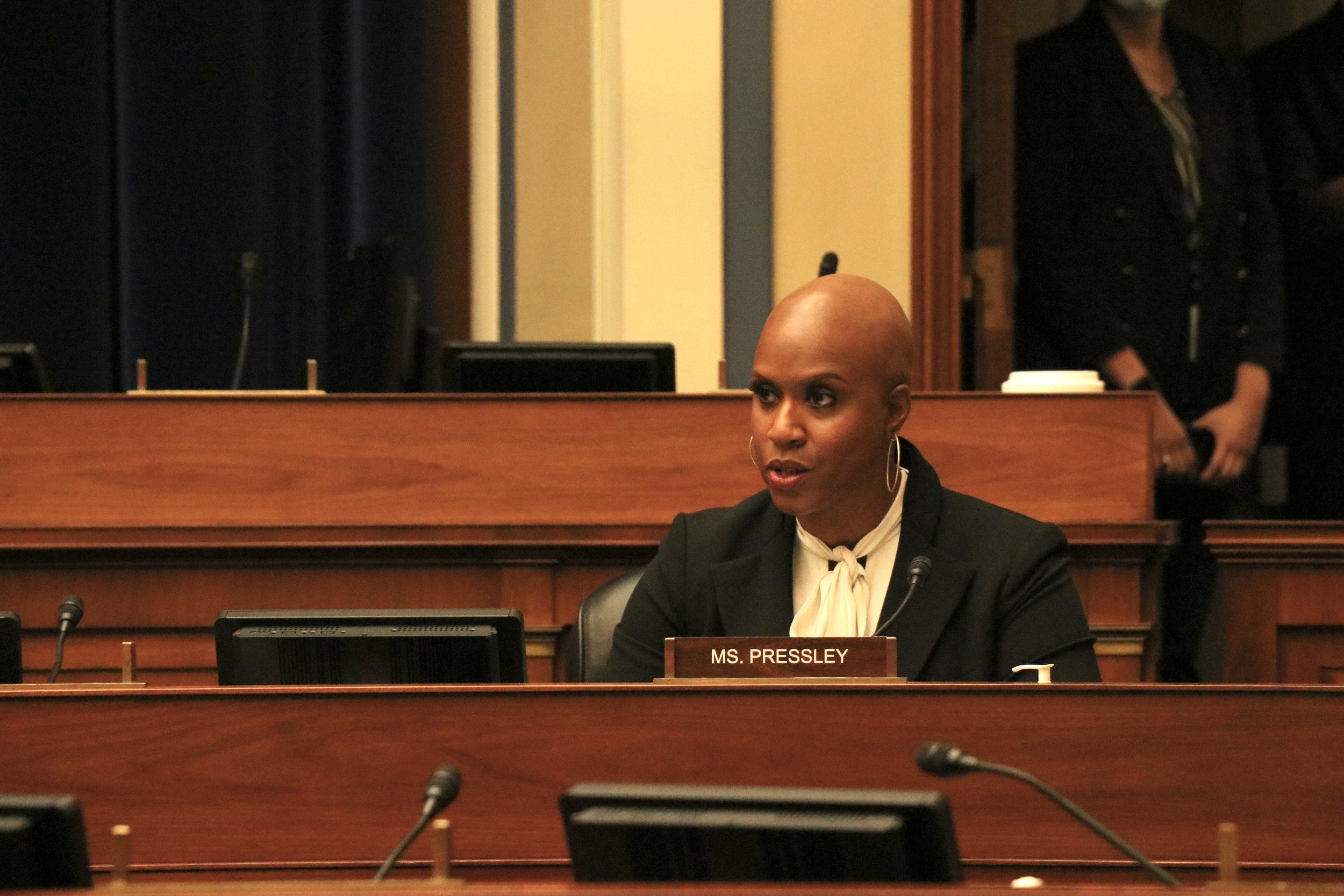 Rep. Ayanna Pressley, D-Mass., giving her opening remarks to the House Committee on Oversight and Reform. (Julia Mueller/Medill News Service)